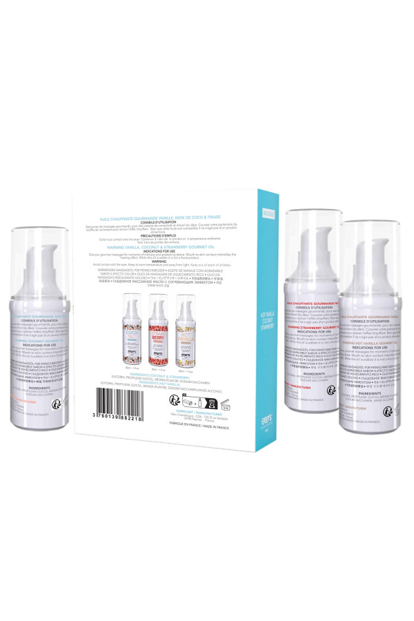 Enduisez votre peau de fragrances pleines de sensualité avec ces huiles de massage aux senteurs d'évasion : vanille, fraise et noix de coco. Elles sont chauffantes sous l'effet du massage pour lui donner plus d'intensité, leur texture est douce et ne colle pas.