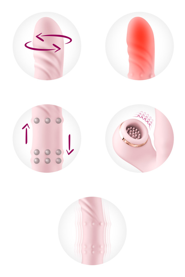 - Fonctions : Tête rotative, tapotement clitoridien, va-et-vient, vibration, chaleur